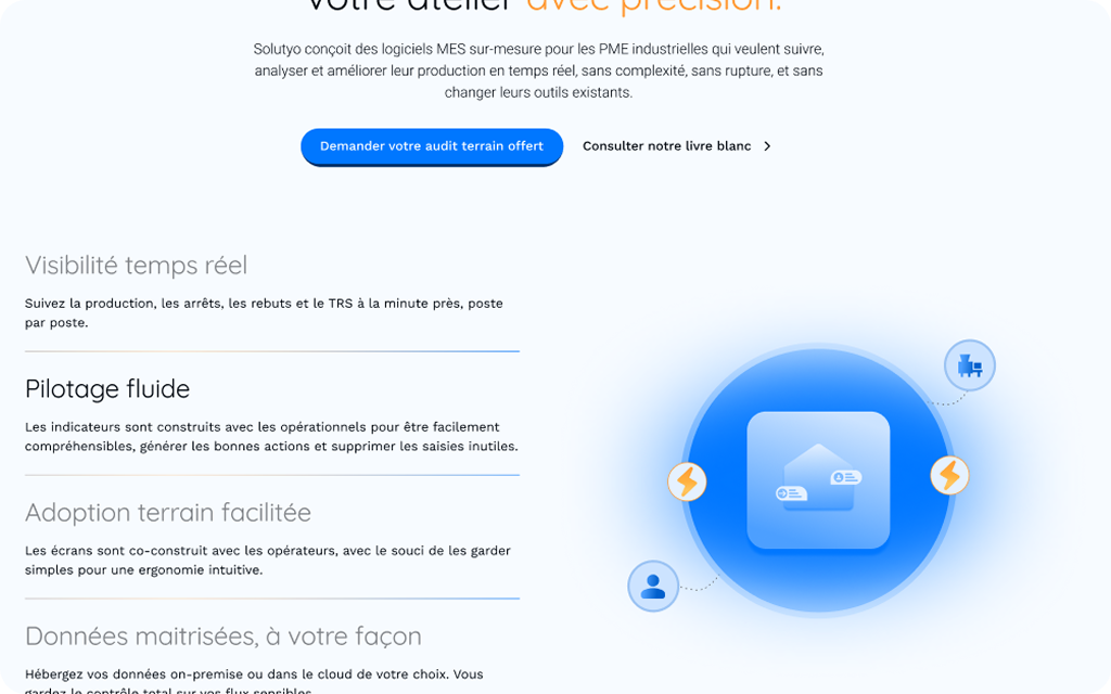 Le marché du MES (Manufacturing Execution System) est saturé d'outils gris et austères. Solutyo avait la technologie pour disrupter le secteur, mais leur image renvoyait celle d'un prestataire technique classique. L'objectif était clair : ne plus être perçu comme un simple logiciel, mais comme un partenaire de productivité indispensable.